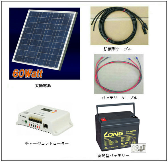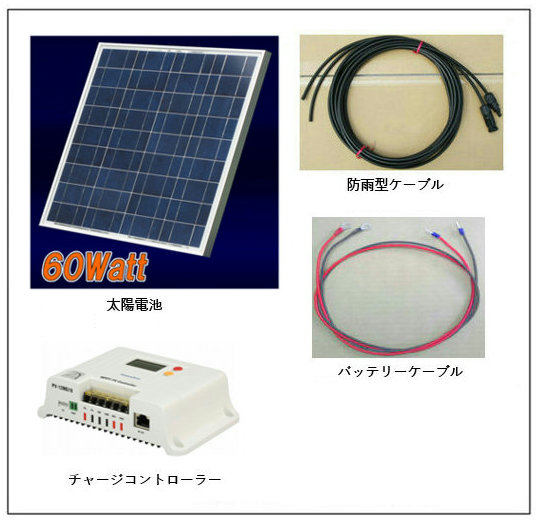 太陽電池-コントローラー間:5m・防雨ソケット付、コントローラー-バッテリー間:1m・端子付、太陽電池架台付き