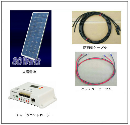 太陽電池-コントローラー間:5m・防雨ソケット付、コントローラー-バッテリー間:1m・端子付、太陽電池架台付き